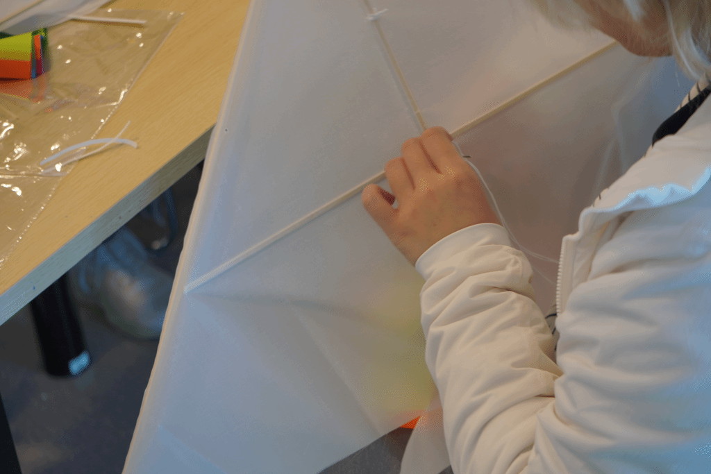 Next, participants flipped the kite to its front side to attach the wire—the strings that steer and control flight. This process entailed paramount precision: the upper bridle line was measured at 11.5 cm from the top, while the lower line extended 15 cm downward. These measurements ensured optimal lift and balance.