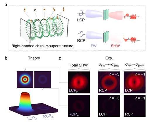 此外,研究人员还通过引入螺旋扭曲设计了三维手性铁电向列相液晶超构器件,实现了强圆二向色性倍频涡旋光束产生(图5a)。研究表明,该现象来源于手性液晶超构器件中的倍频光同时携带自旋锁定的非线性光学几何相位和自旋不依赖的动态相位。如图5b和5c所示,左旋圆偏振(与液晶超构器件的手性相反)和右旋圆偏振基频光泵浦下测得的倍频光强度比约为26:1,对应的非线性圆二向色性值达 ~ 0.93。
