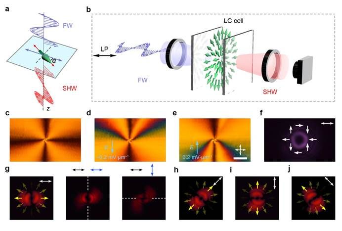 ,其中φ是方位角,q为拓扑荷,其典型织构如图2c所示。在线偏振飞秒激光的泵浦下,由于线性几何相位调制,铁电向列相液晶q板将入射高斯光束转化为了柱矢量涡旋光束(|l| = 2),矢量方向如图2f所示。同时,由于二阶非线性光学响应,还观察到了双瓣/径向的倍频矢量涡旋光(图2g),其中矢量方向围绕中心奇点向外(平行于液晶极性方向),在平行于入射偏振的方向上光强最强(图2h-2j),实验与理论计算结果契合。因此,通过倍频过程我们可以实现对出射光的频率、偏振、振幅的多维调控。