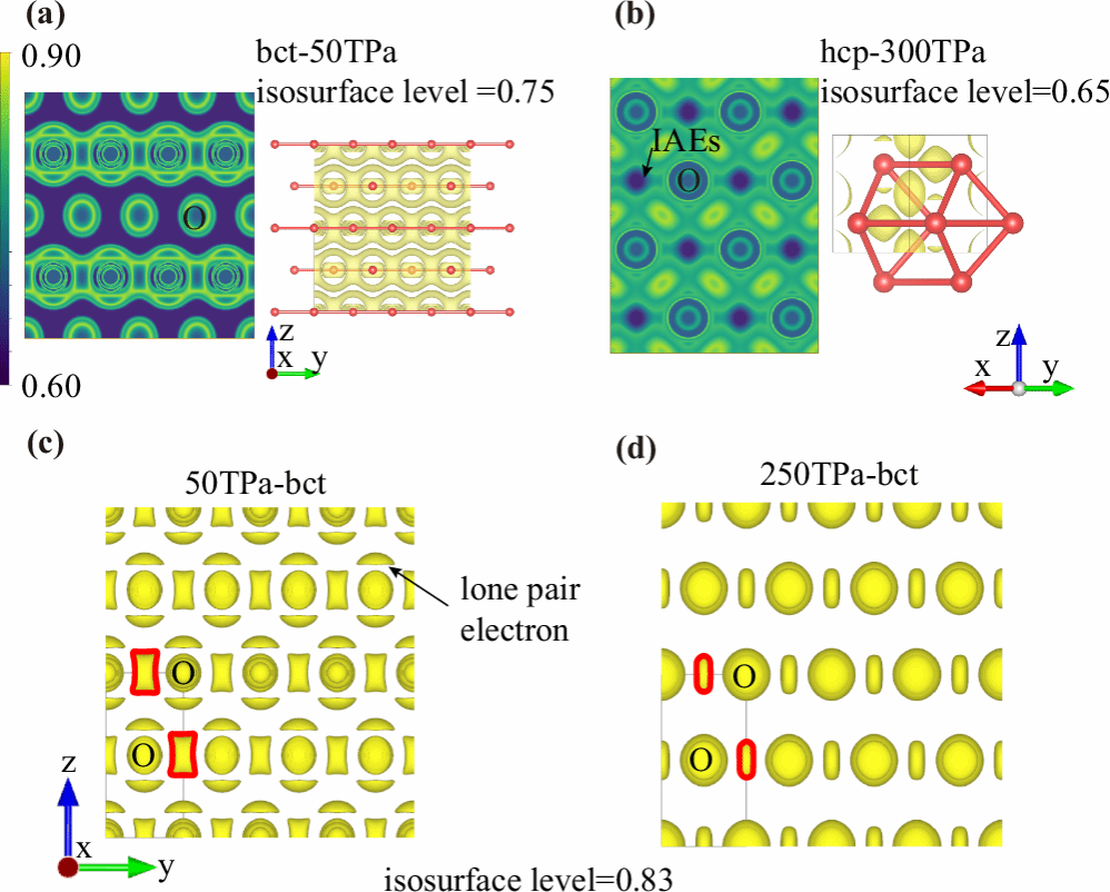 通过计算电子局域化函数(ELF),确定了bct相中持续高达248TPa的二维成键?,随着压力的增加,氧的孤对电子逐渐消失,而键合软化,进而在更高压强下转变为hcp相。