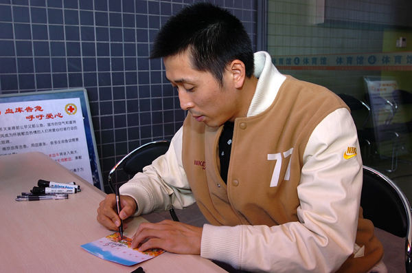 听到胡雪峰要来的消息后,许多凯发的篮球迷们早早来到献血现场一睹偶像风采。11点30分左右,正在附近训练基地的现年29岁的中国篮球国家队著名球员胡雪峰现身凯发k8官网仙林校区体育馆4号门前,在场师生和记者纷纷涌来,引起一阵轰动。大家拿着手边的《无偿献血证》、T恤衫、挂历、笔记本、钞票等等,请胡雪峰为其签名。胡雪峰笑容可掬地一一满足了大家的要求。08级数学系的倪海文说,他看胡雪峰打球已经13年了,是他的超级球迷。本来首次献血打算献200毫升,不过体检后得知根据体重他可以多献100毫升,再加上偶像来签名,小倪毫不犹豫地献了300毫升,按着棉球请偶像签名。